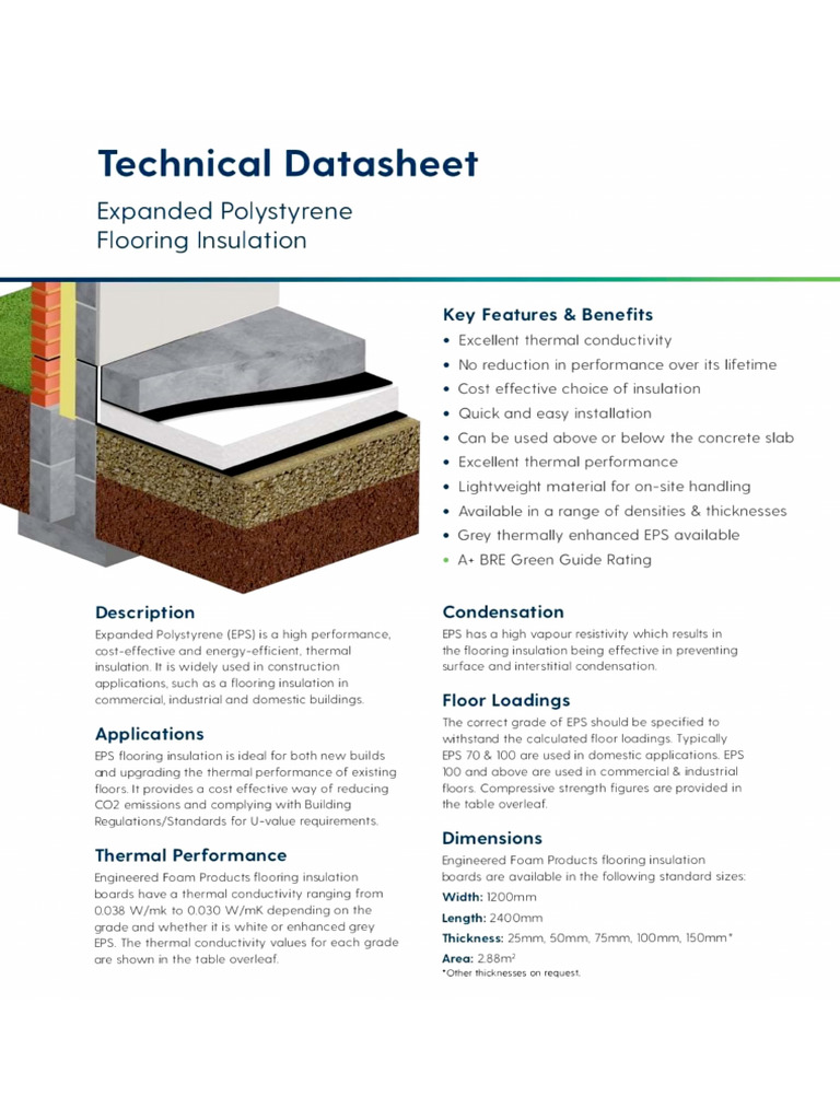 Expanded Polystyrene (EPS) is a cost-effective and energy-efficient thermal insulation widely used for flooring in various building types. It offers excellent thermal performance, high vapour resistivity to prevent condensation, and is available in multiple densities and thicknesses. The product is suitable for both new constructions and upgrades, complying with building regulations for U-value requirements.