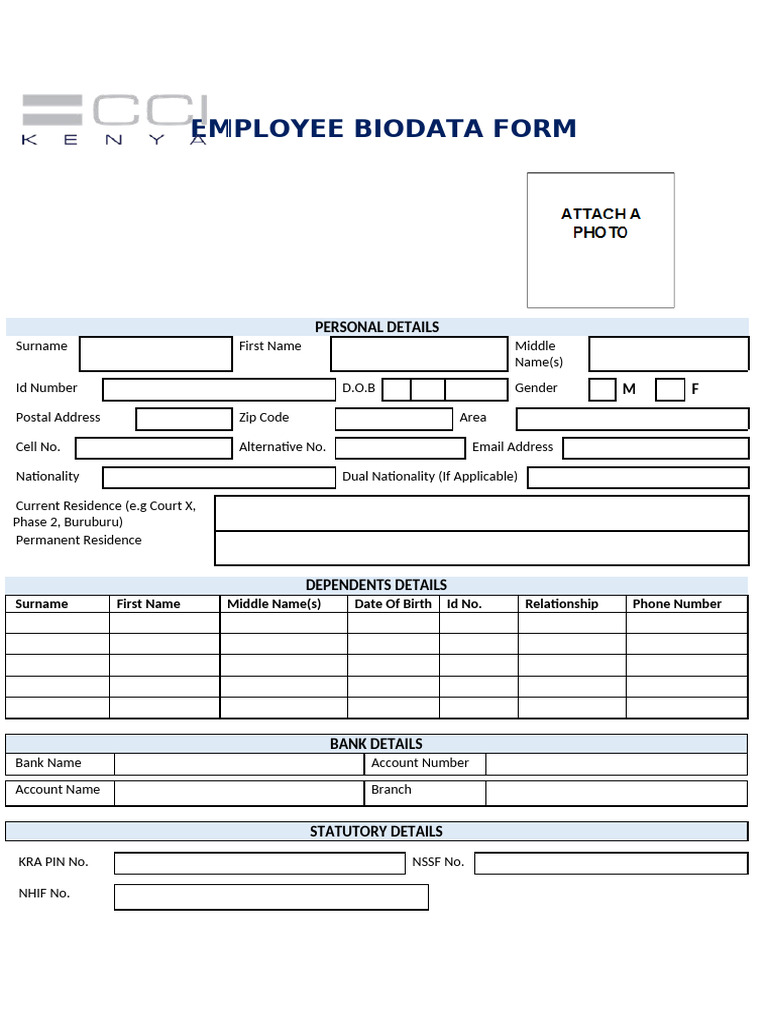 This form must be filled by all employees of CCI Kenya and kept in employee’s Personal File.