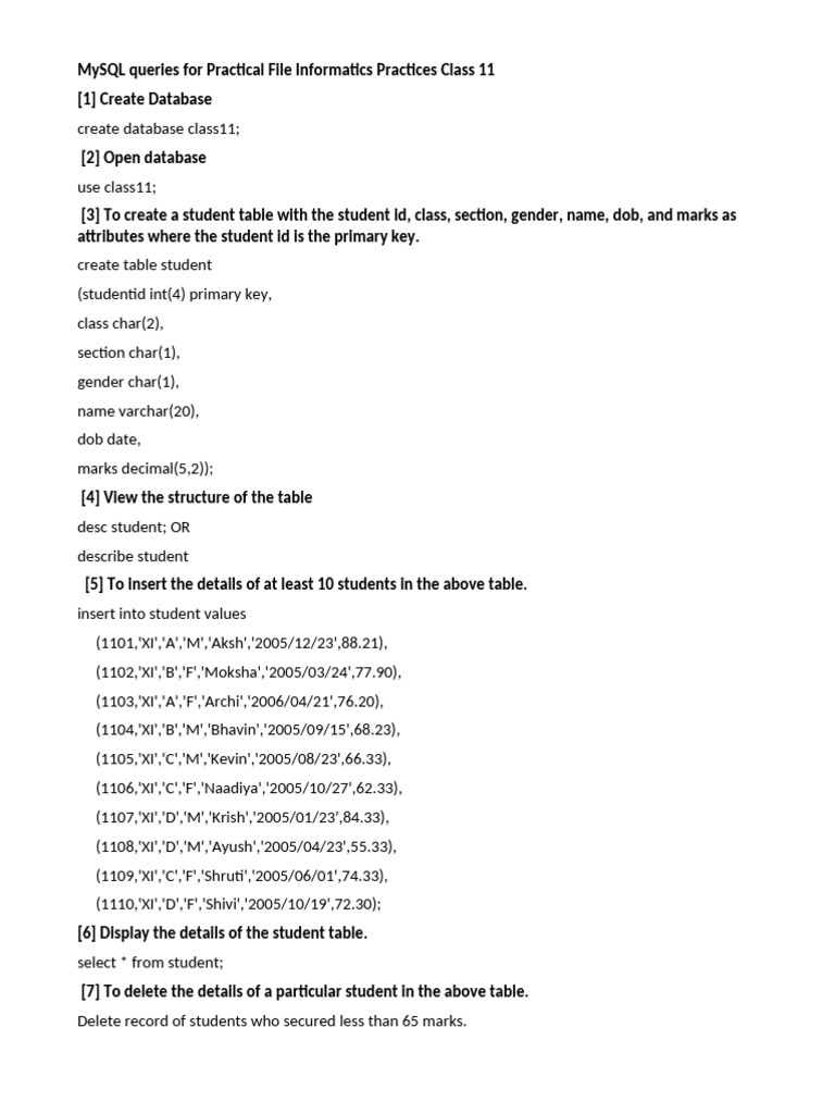 1. INSERT INTO students (student_id, first_name, last_name, age, grade) VALUES (7, ‘Alice’,