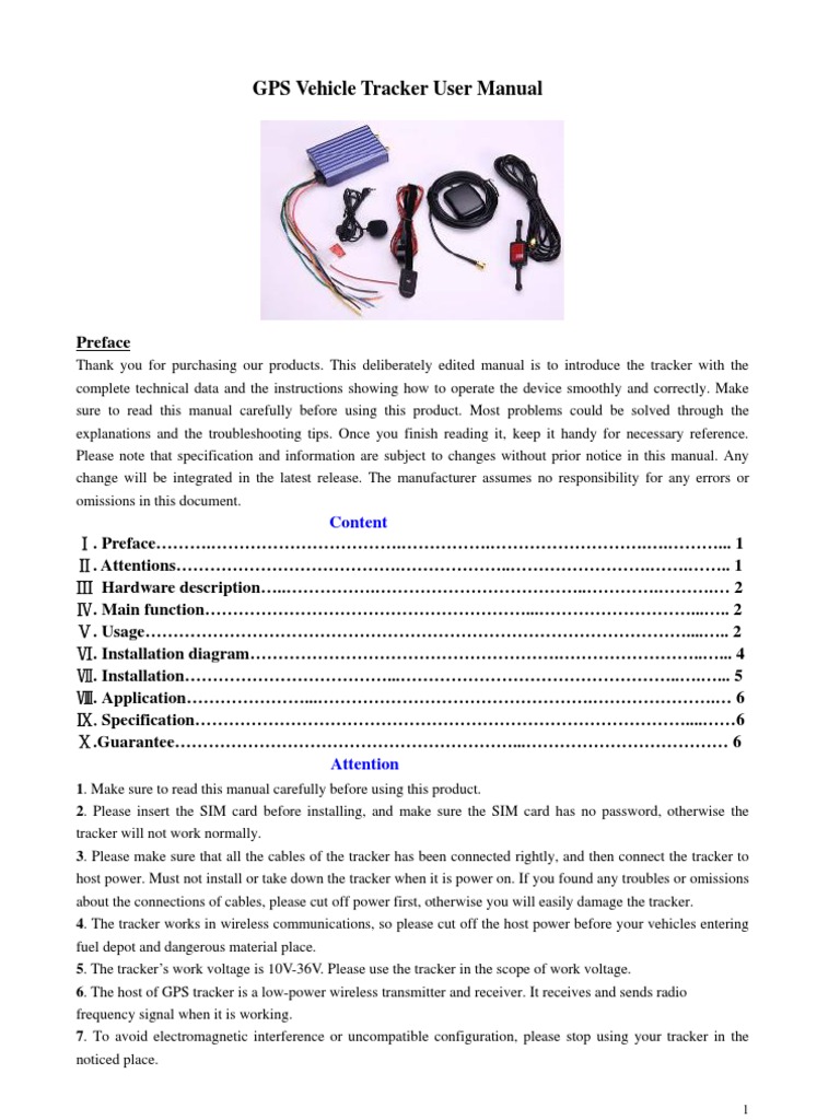 1. Make sure to read this manual carefully before using this product. 2. Please insert the SIM card before installing, and make sure the SIM card has no password, otherwise the tracker will not work normally. 3. Please make sure that all the cables of the tracker has been connected rightly, and then connect the tracker to host power. Must not install or take down the tracker when it is power on. If you found any troubles or omissions about the connections of cables, please cut off power first, otherwise you will easily damage the tracker. 4. The tracker works in wireless communications, so please cut off the host power before your vehicles entering fuel depot and dangerous material place. 5. The trackers work voltage is 10V-36V. Please use the tracker in the scope of work voltage. 6. The host of GPS tracker is a low-power wireless transmitter and receiver. It receives and sends radio frequency signal when it is working. 7. To avoid electromagnetic interference or uncompatible configuration, please stop using your tracker in the noticed place.