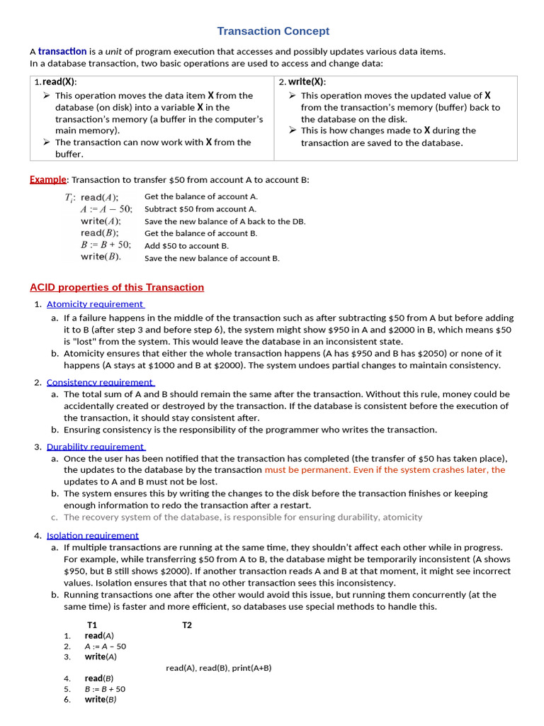 A transaction is a unit of program execution that accesses and possibly updates various data items. This collection