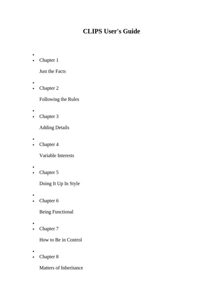 The CLIPS User's Guide can be used in the classroom or for self-teaching. The only