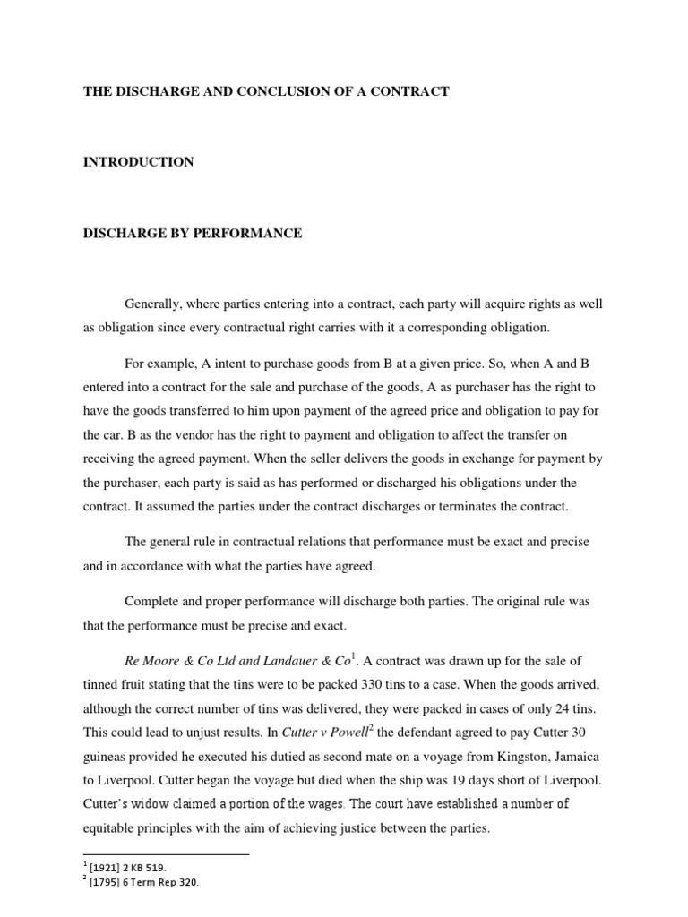 Generally, where parties entering into a contract, each party will acquire rights as well as obligation since every contractual right carries with it a corresponding obligation. For example, A intent to purchase goods from B at a given price. So, when A and B entered into a contract for the sale and purchase of the goods, A as purchaser has the right to have the goods transferred to him upon payment of the agreed price and obligation to pay for the car. B as the vendor has the right to payment and obligation to affect the transfer on receiving the agreed payment. When the seller delivers the goods in exchange for payment by the purchaser, each party is said as has performed or discharged his obligations under the contract. It assumed the parties under the contract discharges or terminates the contract. The general rule in contractual relations that performance must be exact and precise and in accordance with what the parties have agreed. Complete and proper performance will discharge both parties. The original rule was that the performance must be precise and exact. Re Moore & Co Ltd and Landauer & Co1. A contract was drawn up for the sale of tinned fruit stating that the tins were to be packed 330 tins to a case. When the goods arrived, although the correct number of tins was delivered, they were packed in cases of only 24 tins. This could lead to unjust results. In Cutter v Powell2 the defendant agreed to pay Cutter 30 guineas provided he executed his dutied as second mate on a voyage from Kingston, Jamaica to Liverpool. Cutter began the voyage but died when the ship was 19 days short of Liverpool. Cutters widow claimed a portion of the wages. The court have established a number of equitable principles with the aim of achieving justice between the parties.