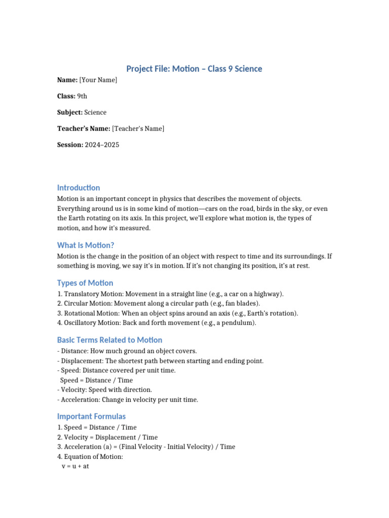 Project File: Motion – Class 9 Science