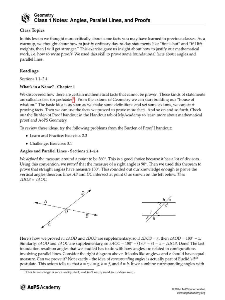 Class 1 Notes: Angles, Parallel Lines, and Proofs