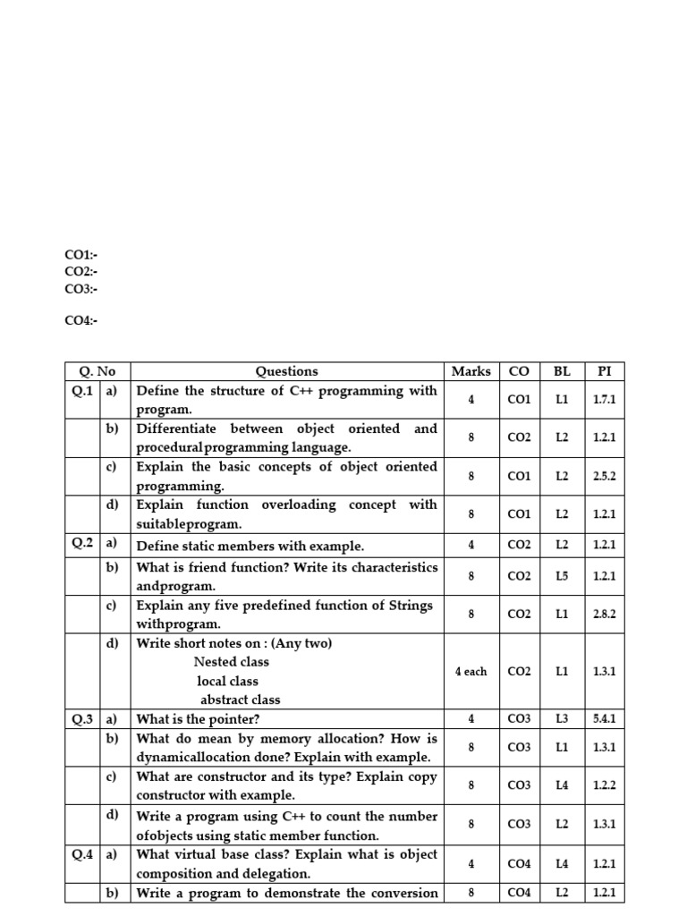 Q. No Questions Marks CO BL PI
