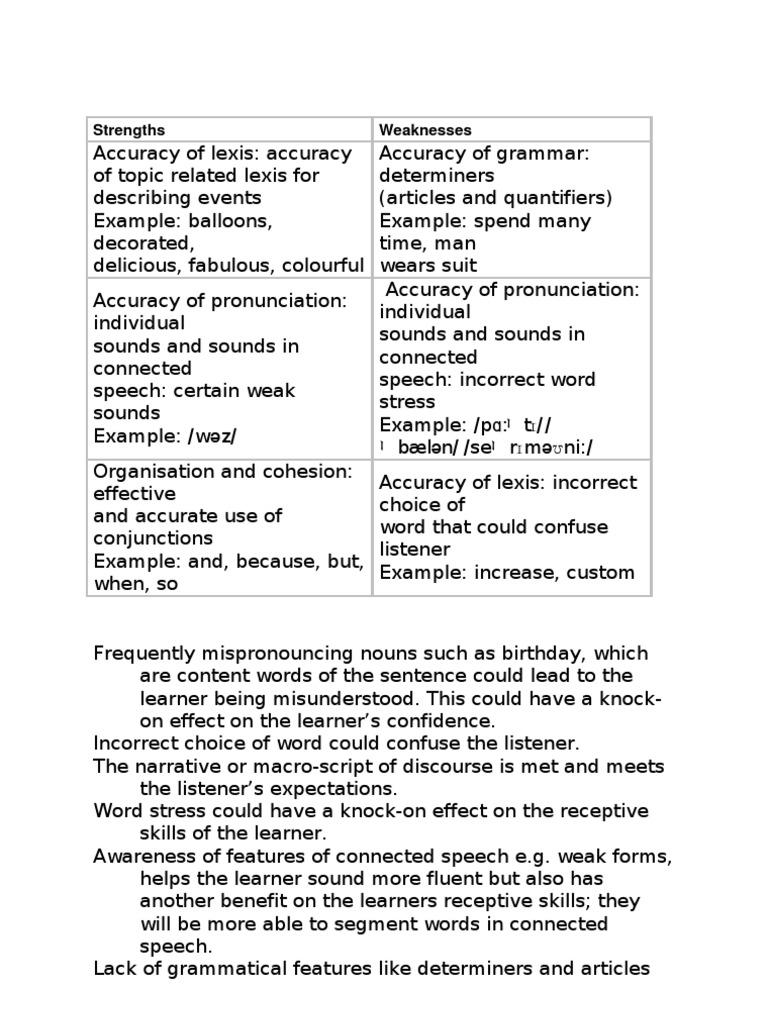 Frequently mispronouncing nouns such as birthday, which are content words of the sentence could lead to the learner being misunderstood. This could have a knockon effect on the learners confidence. Incorrect choice of word could confuse the listener. The narrative or macro-script of discourse is met and meets the listeners expectations. Word stress could have a knock-on effect on the receptive skills of the learner. Awareness of features of connected speech e.g. weak forms, helps the learner sound more fluent but also has another benefit on the learners receptive skills; they will be more able to segment words in connected speech. Lack of grammatical features like determiners and articles