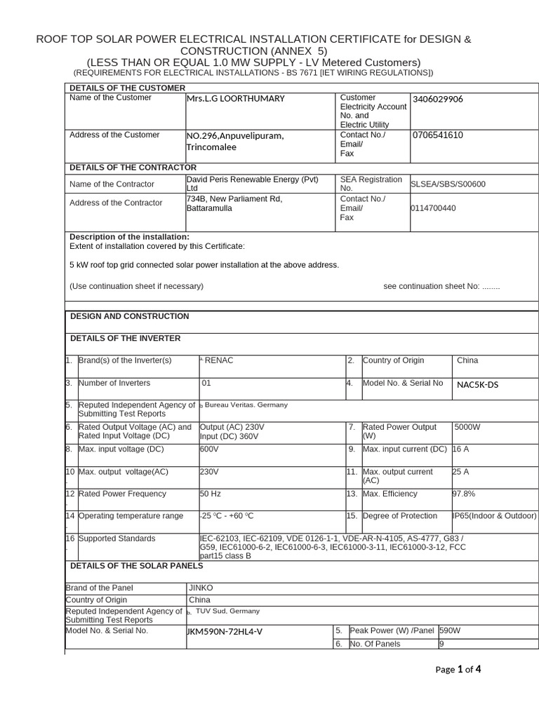 ROOF TOP SOLAR POWER ELECTRICAL INSTALLATION CERTIFICATE for DESIGN &
