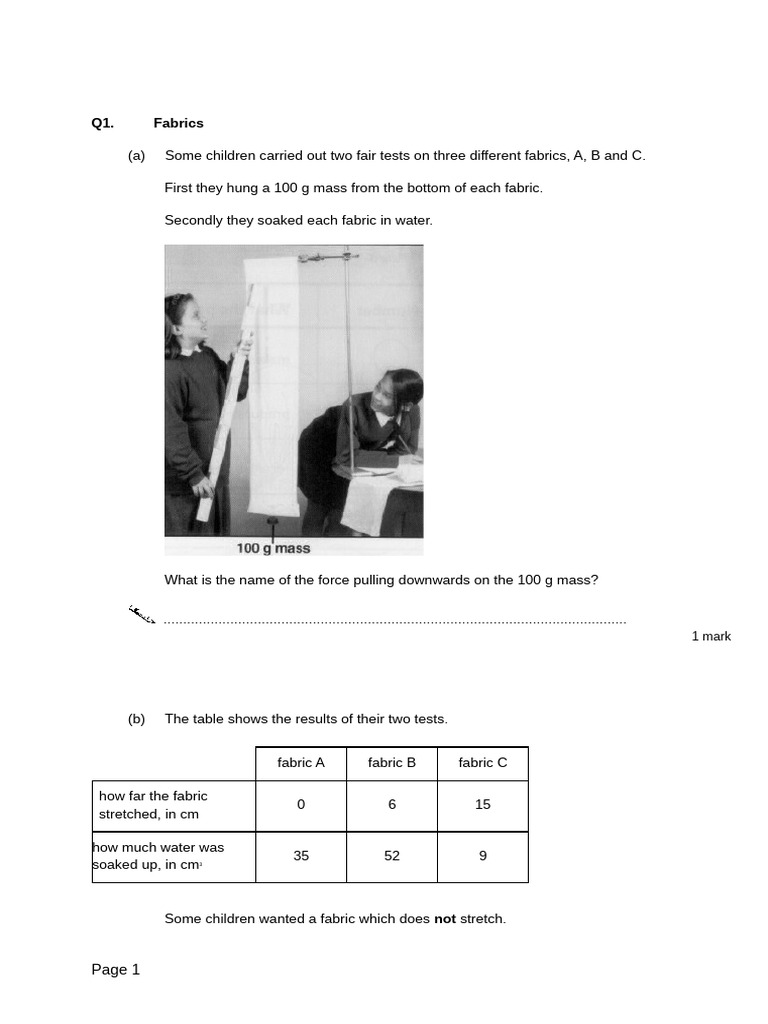 (a) Some children carried out two fair tests on three different fabrics, A, B and C.
