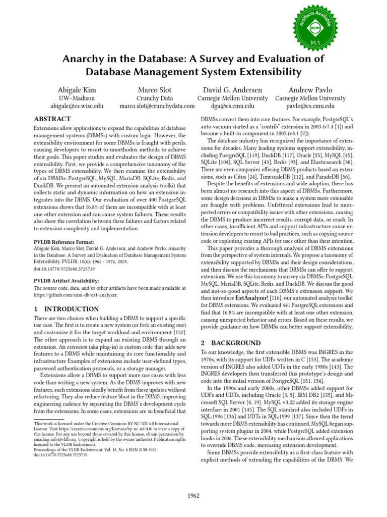 Extensibility. PVLDB, 18(6): 1962 - 1976, 2025. extensibility supported by DBMSs and their design considerations,
