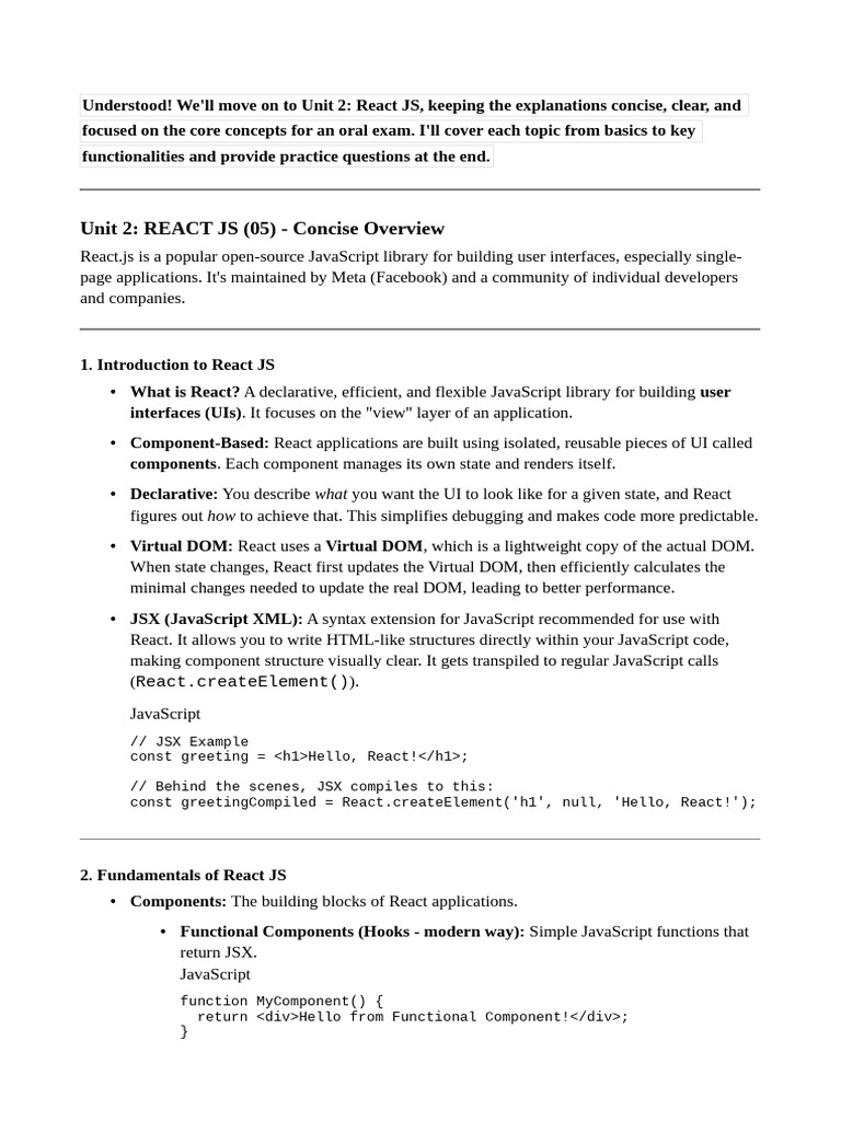 We'll move on to Unit 2: React JS, keeping the explanations concise, clear, and