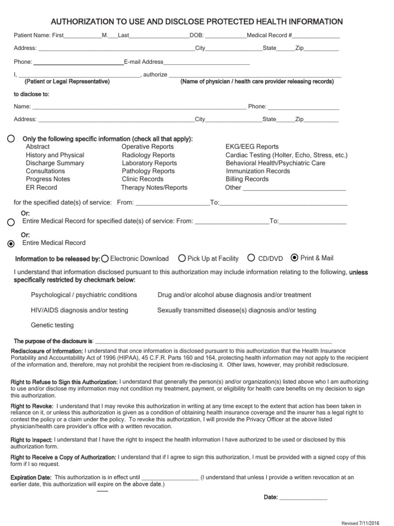 Entire Medical Record for specified date(s) of service: From: _____________________To:___________________