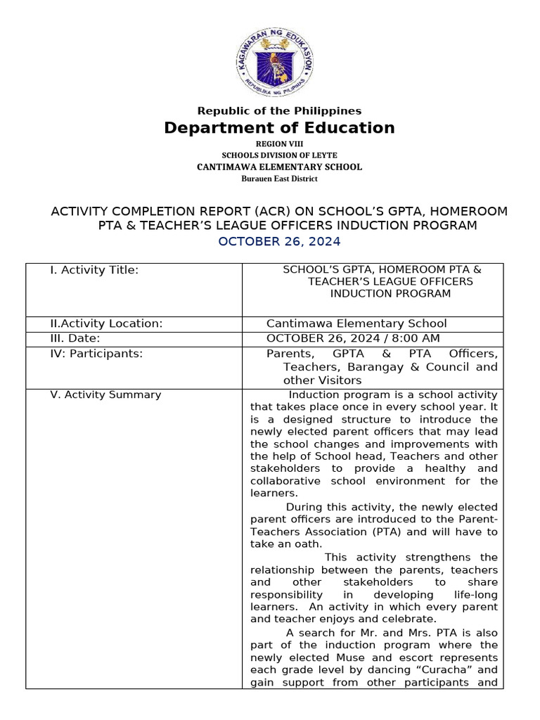 ACTIVITY COMPLETION REPORT (ACR) ON SCHOOL’S GPTA, HOMEROOM