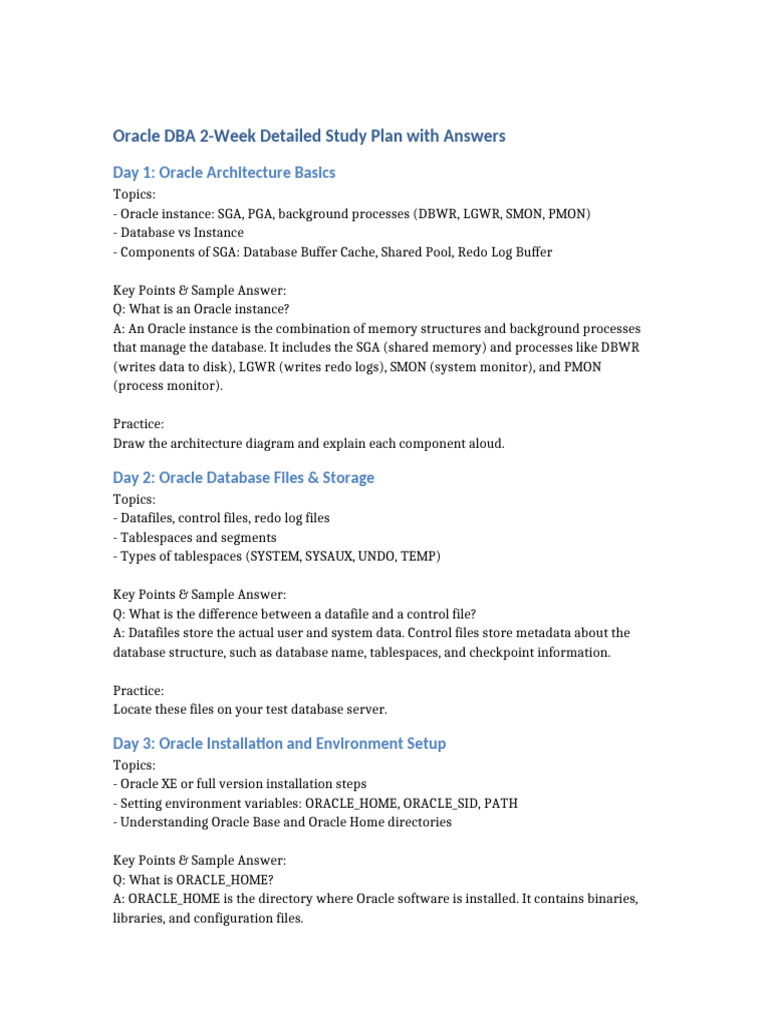 Oracle DBA 2-Week Detailed Study Plan with Answers