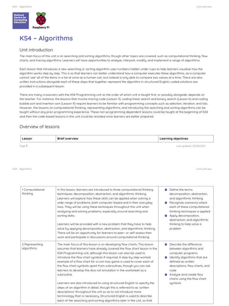 KS4 – Algorithms Unit overview