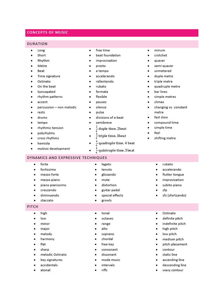 the elements/concepts). E.g. loud vs. soft, long notes vs. short notes, polyphonic texture vs. homophonic