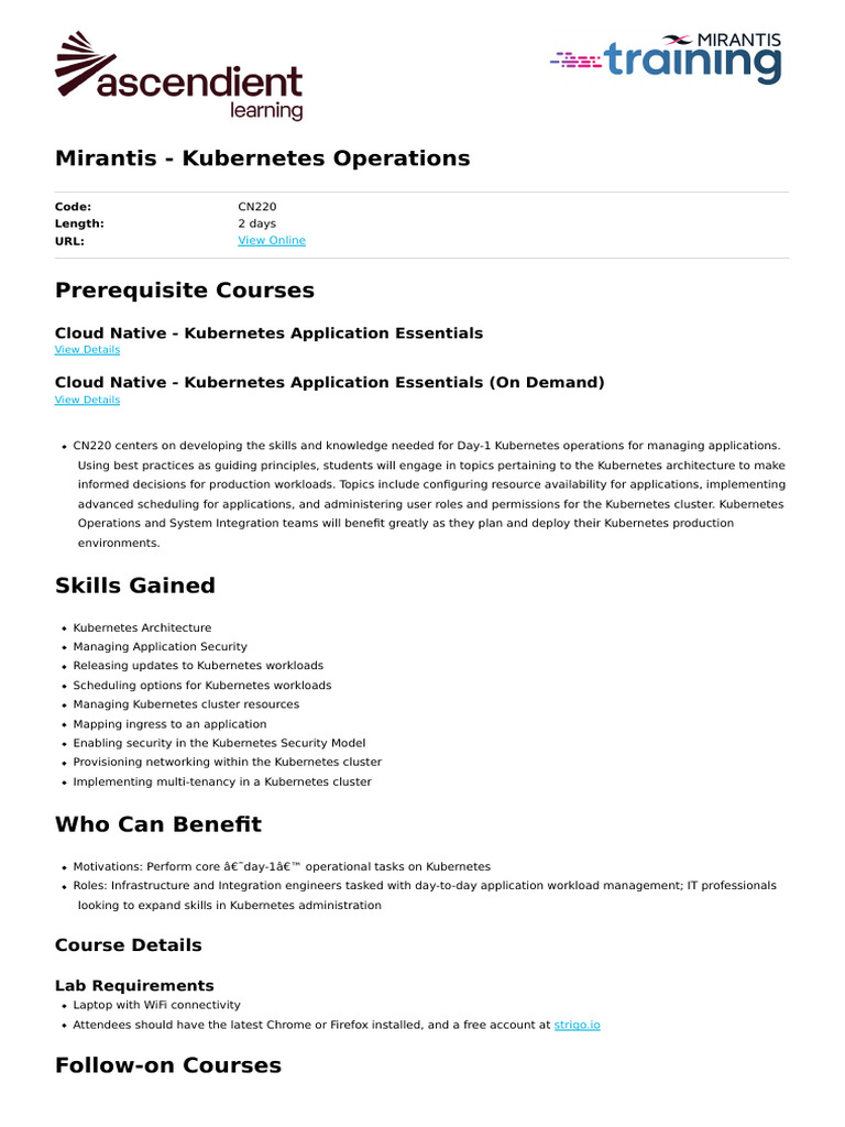 CN220 centers on developing the skills and knowledge needed for Day-1 Kubernetes operations for managing applications.
