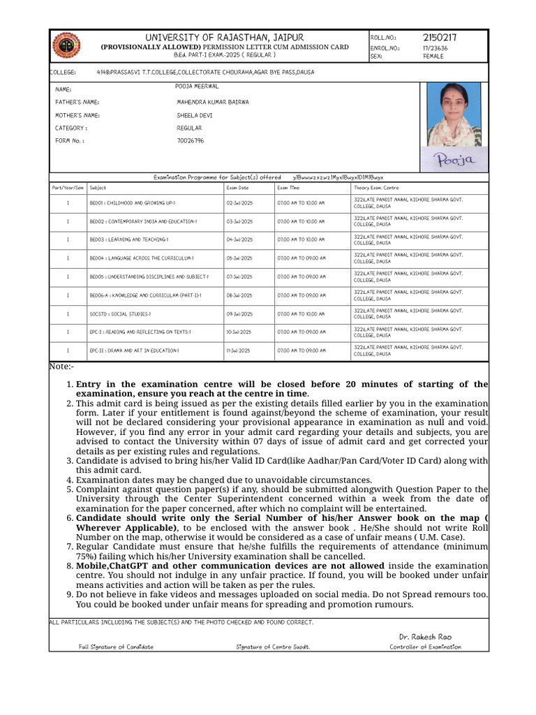 UNIVERSITY OF RAJASTHAN, JAIPUR ROLL.NO.