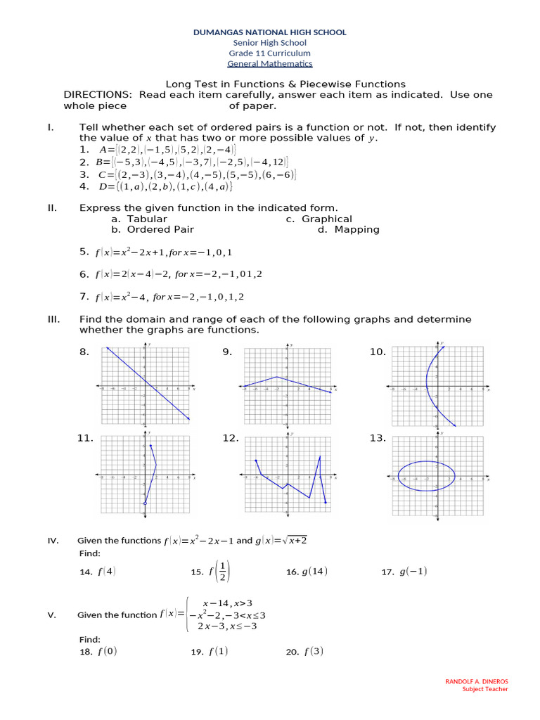 I. Tell whether each set of ordered pairs is a function or not. If not, then identify