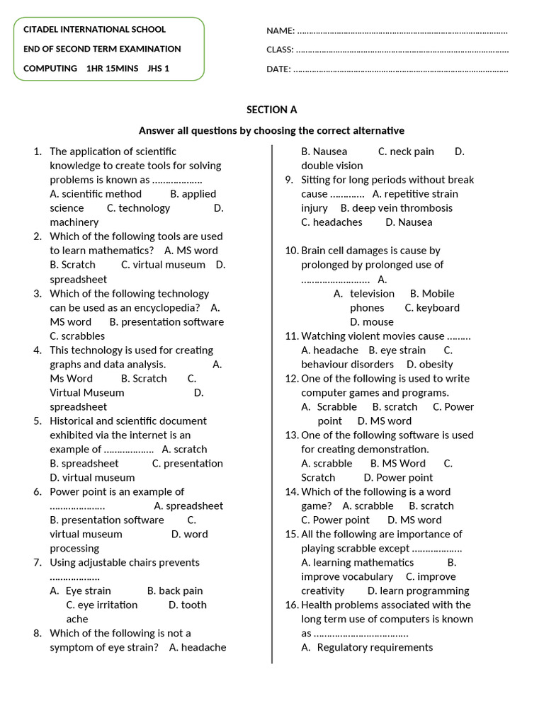 END OF SECOND TERM EXAMINATION CLASS: ………………………………………………………………………………..