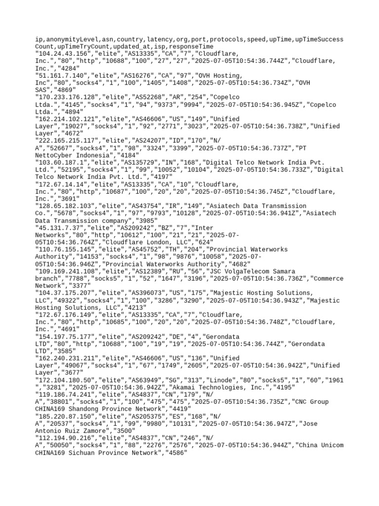 ip,anonymityLevel,asn,country,latency,org,port,protocols,speed,upTime,upTimeSuccess