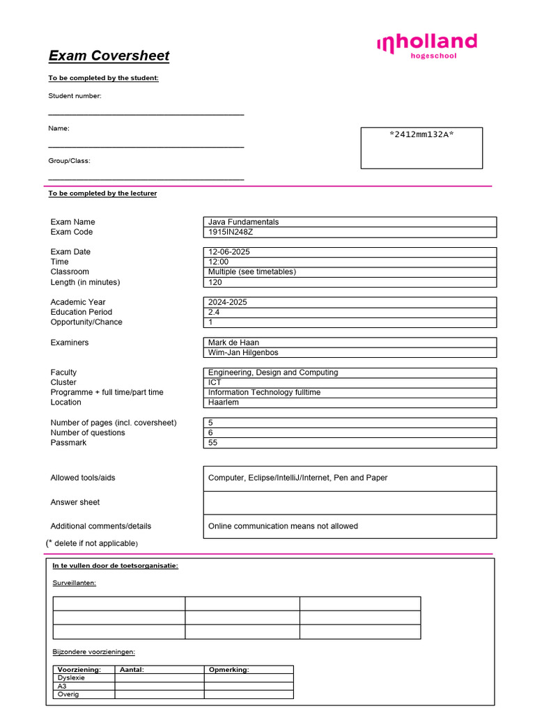 Allowed tools/aids Computer, Eclipse/IntelliJ/Internet, Pen and Paper