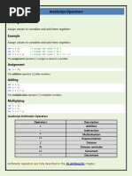 Assignment operators are used to assign values to JavaScript variables. Given that x=10 and y=5, the table below explains the assignment operators: Operator = += -= *= /= %= Example x=y x+=y x-=y x*=y x/=y x%=y Same As x=x+y x=x-y x=x*y x=x/y x=x%y Result x=5 x=15 x=5 x=50 x=2 x=0