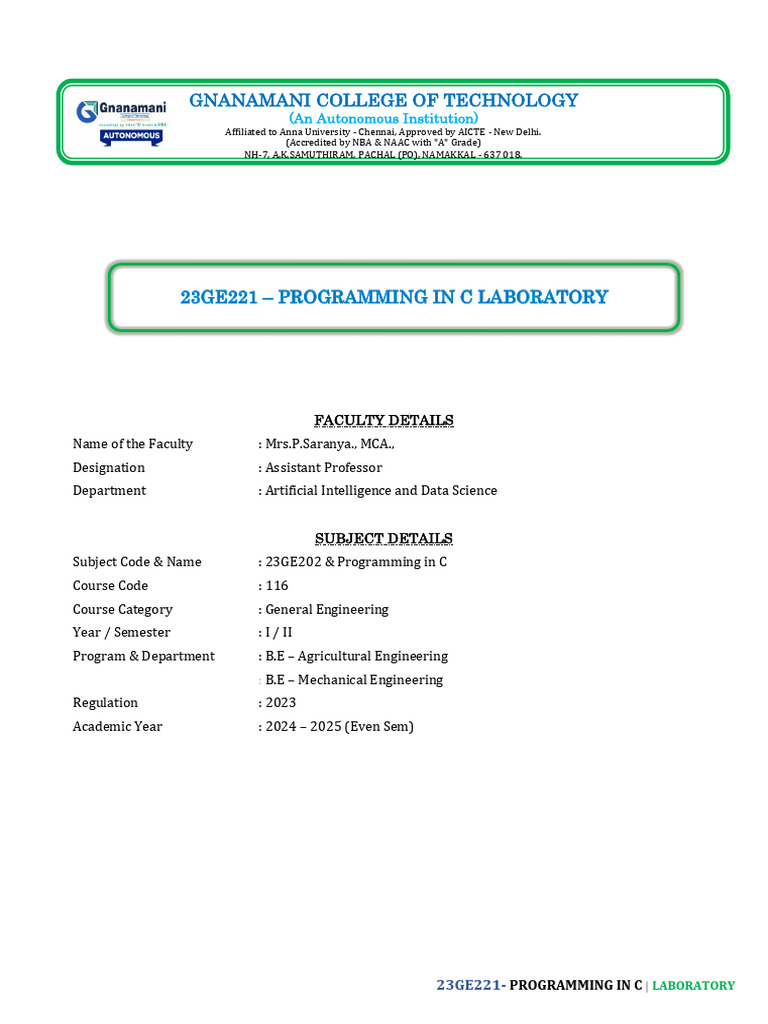 CO1: To demonstrate knowledge on C programming constructs and develop programs in C using basic