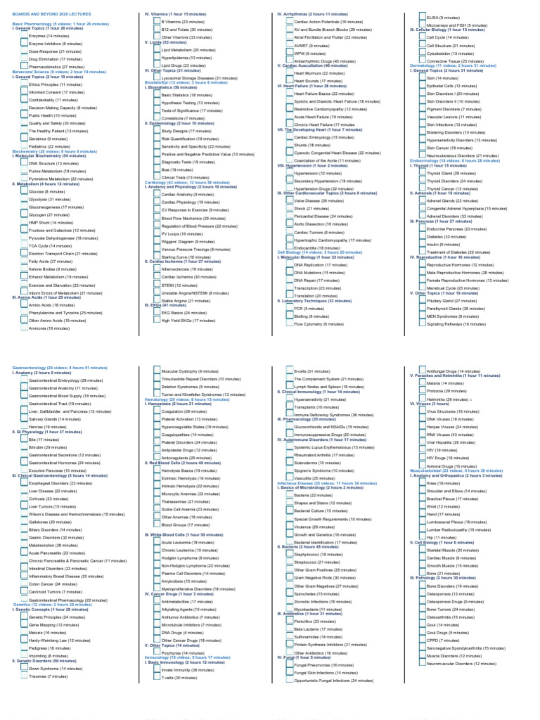 I. Anatomy (2 hours 0 minutes) Muscular Dystrophy (9 minutes) B-cells (31 minutes) Antifungal Drugs (14 minutes)