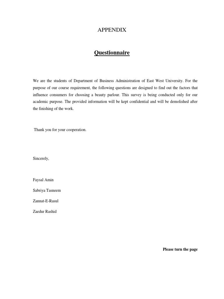 We are the students of Department of Business Administration of East West University. For the purpose of our course requirement, the following questions are designed to find out the factors that influence consumers for choosing a beauty parlour. This survey is being conducted only for our academic purpose. The provided information will be kept confidential and will be demolished after the finishing of the work.