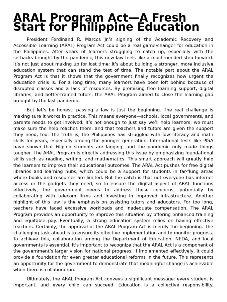 Ultimately, the ARAL Program Act conveys a significant message: every student is