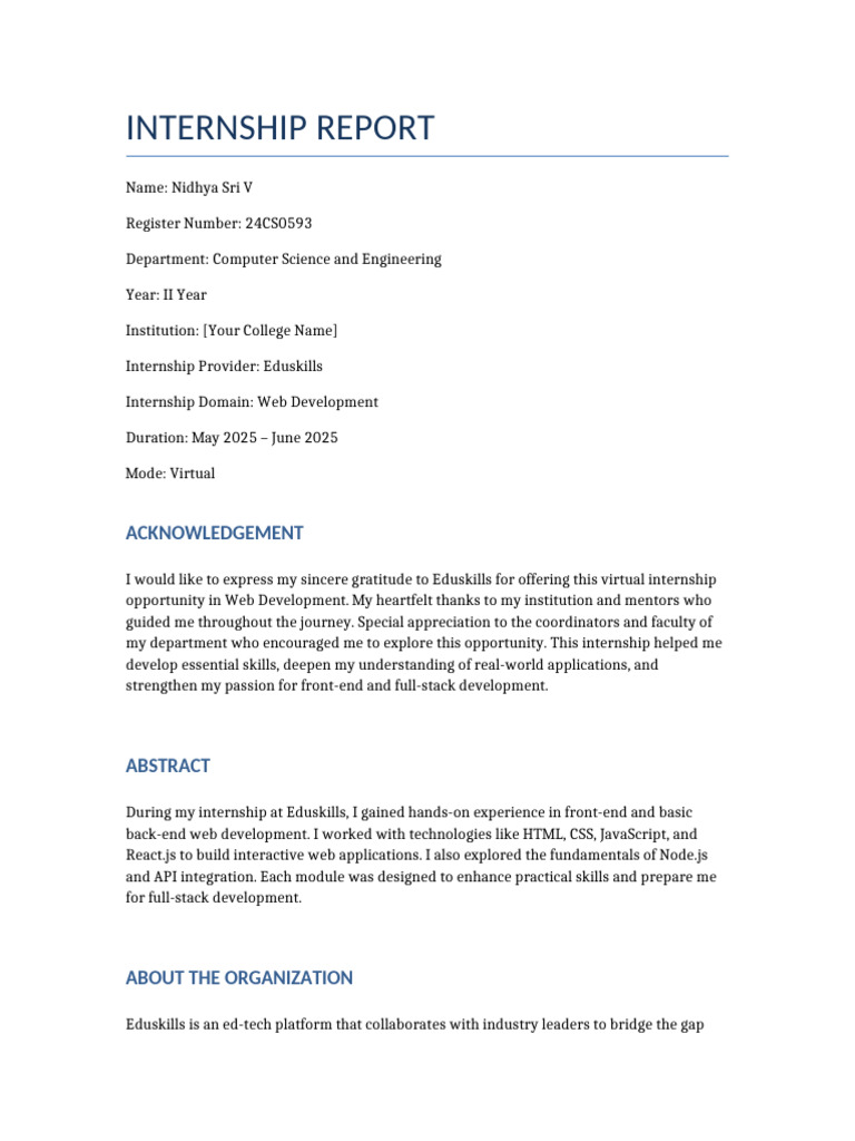 During my internship at Eduskills, I gained hands-on experience in front-end and basic