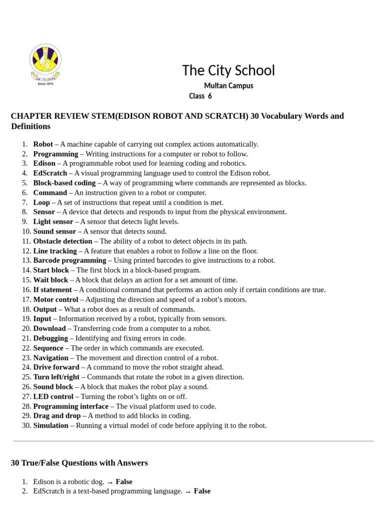 CHAPTER REVIEW STEM(EDISON ROBOT AND SCRATCH) 30 Vocabulary Words and