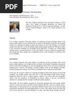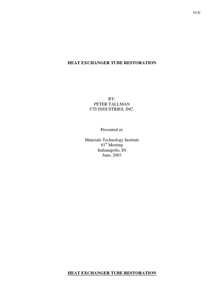 application, particularly on pitted surfaces, and requires specially developed devices. Coatings also have strict limitations regarding temperature and corrosive environments. Coatings on heat exchangers are also applied by dipping, which enables internal and external coating of tubes as well as tubesheets and baffles. Dating back over half a century, this form of corrosion protection, utilizing baked phenolic coatings, has been effectively used on selected exchangers. The drawback is that immersion coating application can only be done in the workshop. Consequently, this technique is essentially limited to new exchangers, and strictly speaking, is not a restoration method. Summary Heat exchanger bundles in the chemical process industry frequently experience severe erosion/corrosion damage at the tube ends. Thin-walled metallic tube inserts (I.D. tube shields) installed by roller expanding have been effectively used for over 25 years for restoring damaged tubes and returning the condenser tubes to full active service.