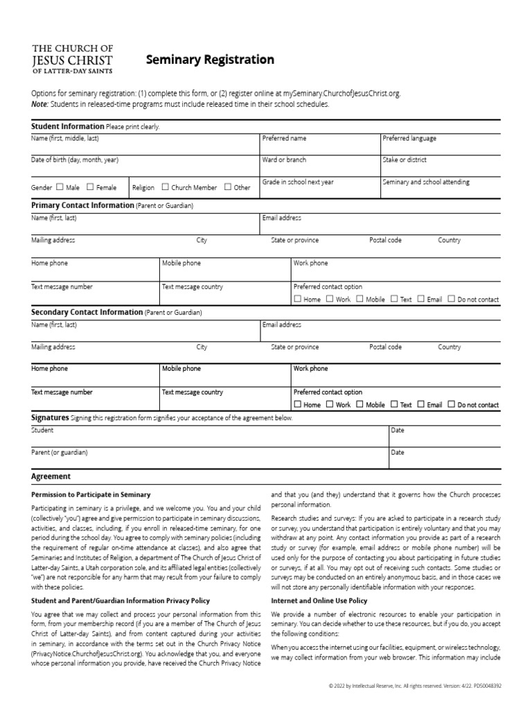 activities, and classes, including, if you enroll in released-time seminary, for one or survey, you understand that participation is entirely voluntary and that you may