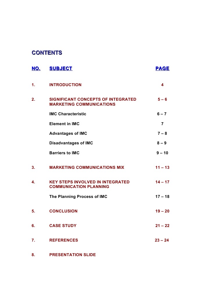 http://en.wikipedia.org/wiki/Integrated%5FMarketing %5FCommunications Integrated Marketing Communication (n.d.). Retrieved January 12, 2010, from http://www.nd.edu/~rdrevs/mark20100/Chap017.ppt Integrated Marketing Communications (n.d.). Retrieved January 12, 2010, from http://www.public.iastate.edu/~sjwong/imc.pdf Lancaster, G. (n.d). Above and below the line promotion: The marketing communications mix. Retrieved January 18, 2010, from http://www.marketingmasters.co.uk/communications.htm Marketing Communications (n.d.). Retrieved January 13, 2010, from http://www.multimediamarketing.com/mkc/marketingcommunications/ Smith, R.D. (2008). Strategic Planning for Public Relations: Nine-step planning process. Retrieved January 20, 2010, from http://faculty.buffalostate.edu/smithrd/PR/steps.htm The Marketing Communications or Promotional Mix (n.d.). Retrieved January 18,2010, from http://www.davedolak.com/promix.htm Vesna, D., Vinka, F., Radmila, J. (n.d.). The Planning Process of Integrated Marketing Communication. Retrieved January 11, 2010, from http://www.docstoc.com/docs/20209968/THE-PLANNING-PROCESSOF-INTEGRATED-MARKETING-COMMUNICATION
