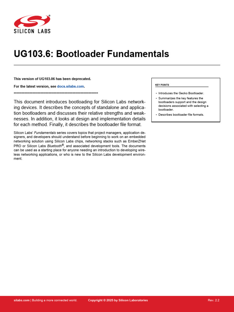 Suite (GSDK) 4.0 in December of 2021. This new version is documented in UG489: Silicon Labs Gecko Bootloader User’s Guide for