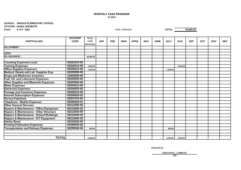 PARTICULARS CODE CASH JAN FEB MAR APRIL MAY JUNE JULY AUG SEP OCT NOV DEC