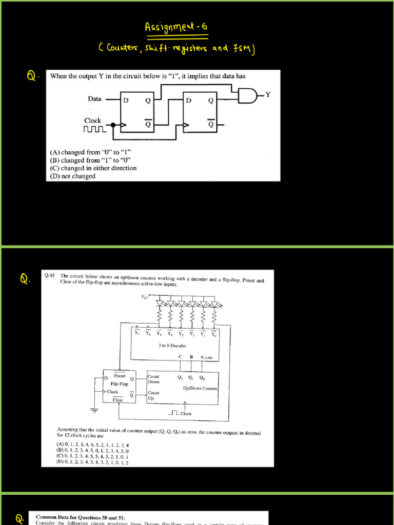 The document discusses the behavior of various flip-flops and counters in digital circuits, particularly focusing on clock pulses and output frequencies. It mentions the use of JK flip-flops and a 3-bit gray counter, along with the initial states and transitions of these components. Additionally, it poses questions regarding the frequency of outputs in specific configurations of the circuits described.