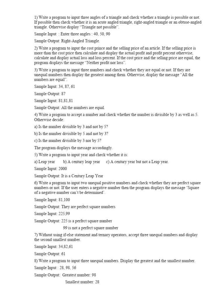 1) Write a program to input three angles of a triangle and check whether a triangle is possible or not.