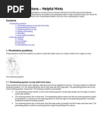 1 History 2 Exclusively penetrative positions o 2.1 Penetrating partner on top with front entry o 2.2 Penetrating from behind o 2.3 Receiving partner on top o 2.4 Sitting and kneeling o 2.5 Standing o 2.6 Anal sex positions o 2.7 Less-common positions 2.7.1 Others o 2.8 Using furniture or special apparatus o 2.9 Positions to promote or prevent conception o 2.10 Positions during pregnancy 3 Non-exclusively penetrative positions o 3.1 Oral sex positions 3.1.1 Fellatio 3.1.2 Cunnilingus 3.1.3 Sixty-nine 3.1.4 Anilingus o 3.2 Other positions 4 Non-penetrative positions o 4.1 Genital-genital rubbing