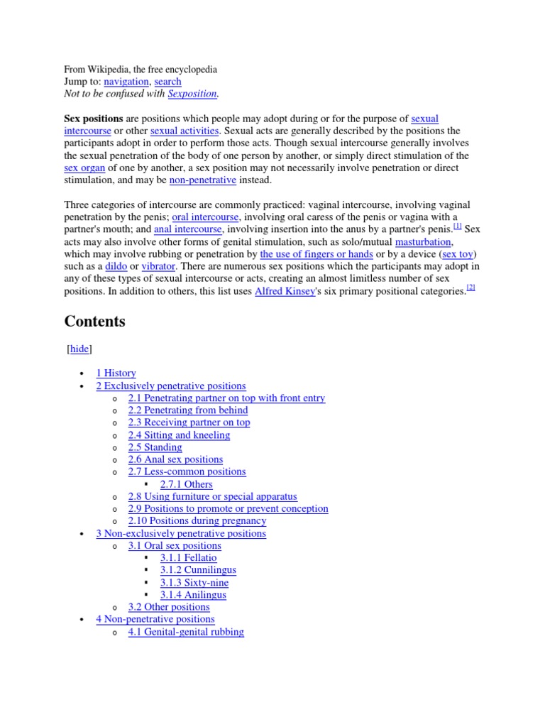 I am highly knowledgeable about this topic (optional) Submit ratings Saved successfully Your ratings have not been submitted yet Categories: Sex positions Sexual acts Sexuality-related lists Hidden categories: All articles with dead external links Articles with dead external links from January 2011