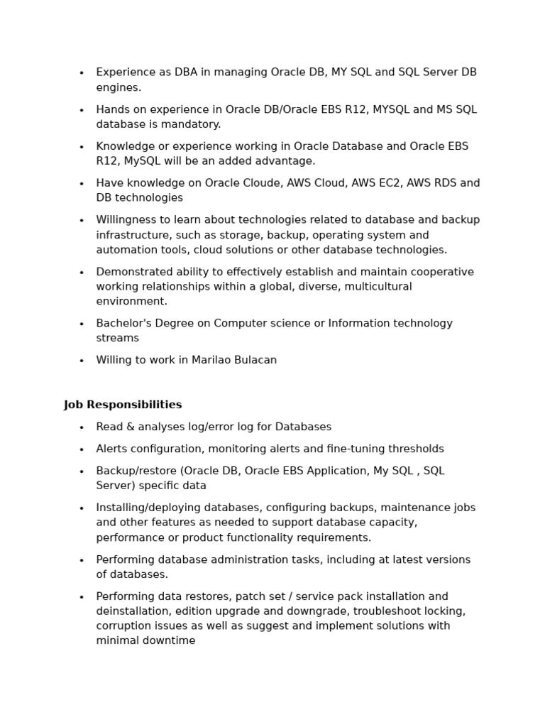 Experience as DBA in managing Oracle DB, MY SQL and SQL Server DB