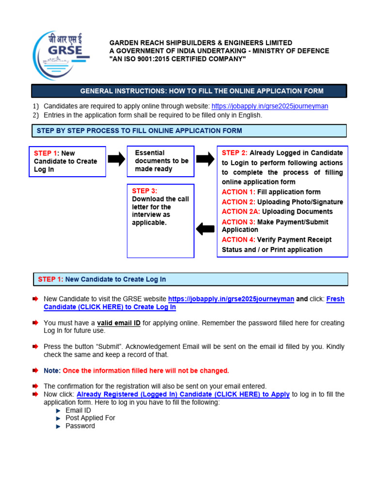 1) Candidates are required to apply online through website: https://jobapply.in/grse2025journeyman