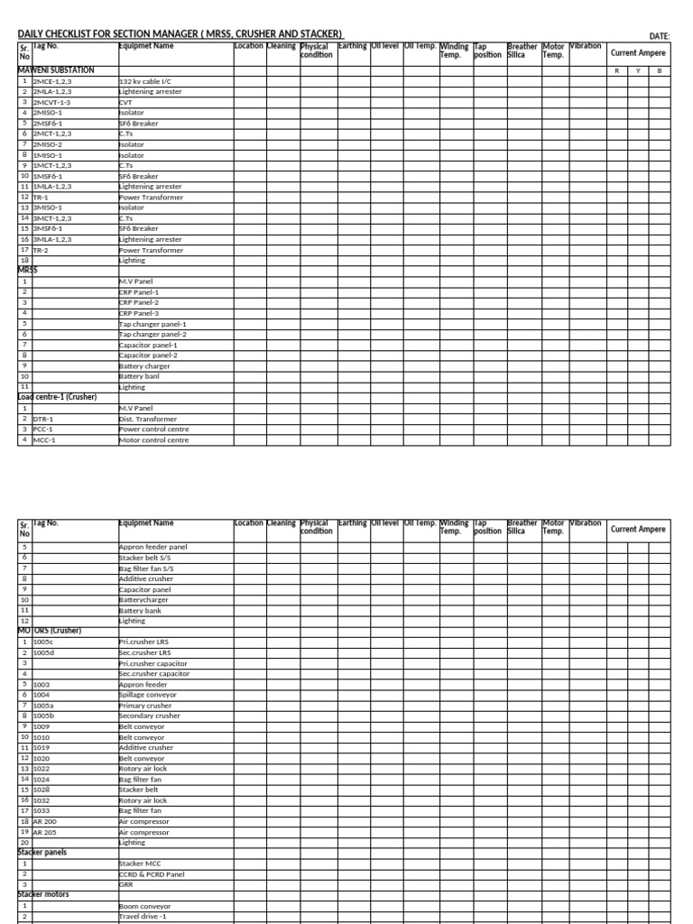 DAILY CHECKLIST FOR SECTION MANAGER ( MRSS, CRUSHER AND STACKER) DATE:
