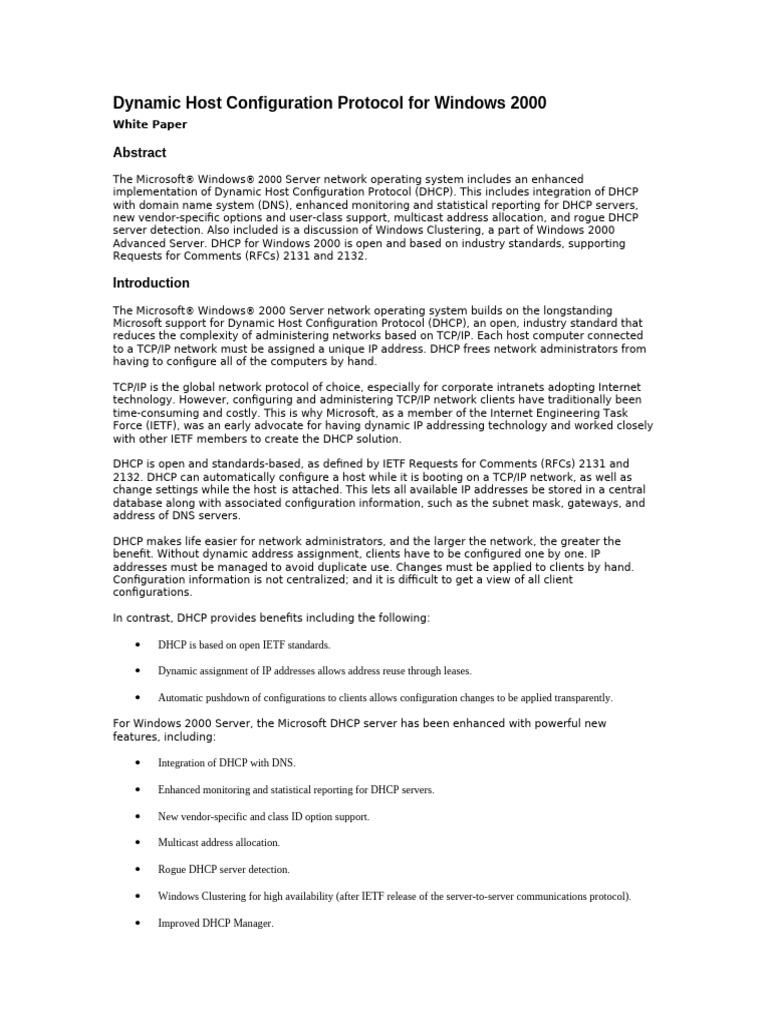 The Microsoft DHCP server for Windows 2000 builds on a long history of support for DHCP and