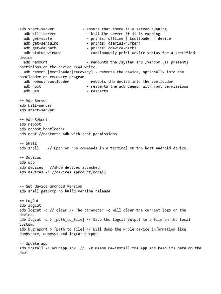 adb shell // Open or run commands in a terminal on the host Android device.