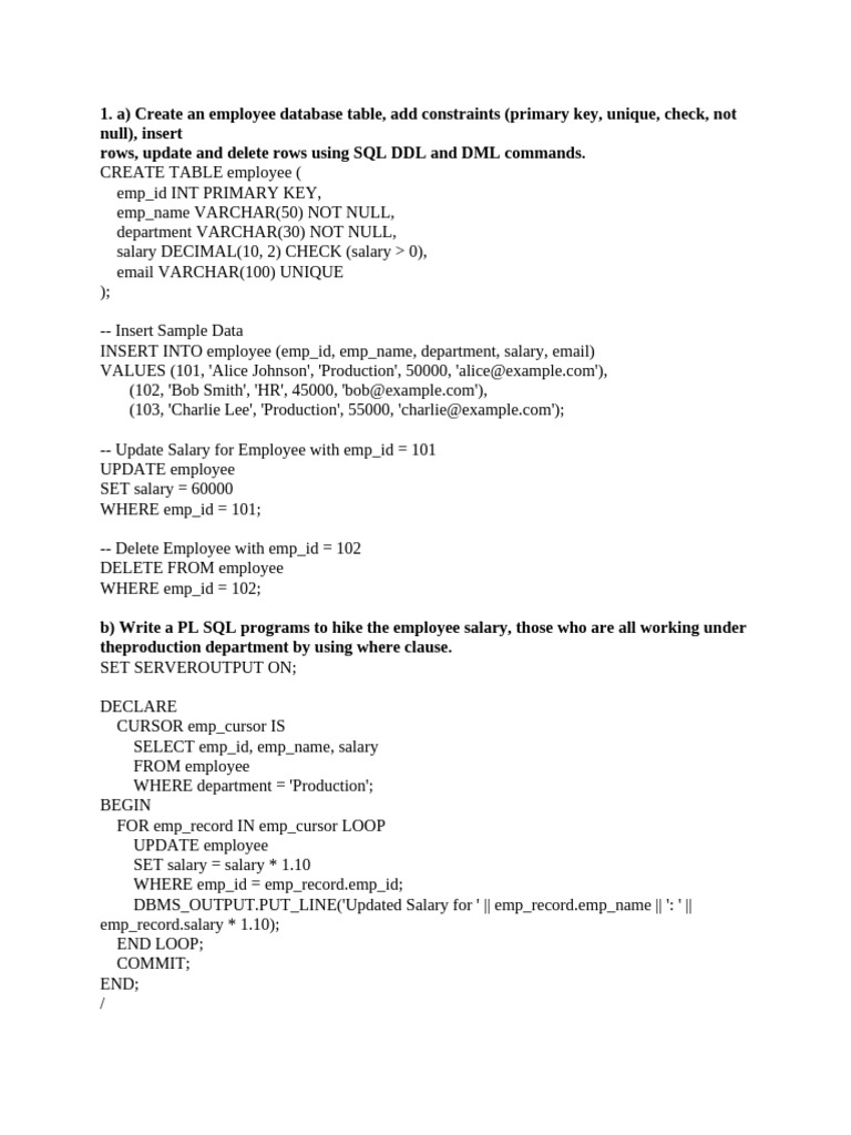 a) Create an employee database table, add constraints (primary key, unique, check, not