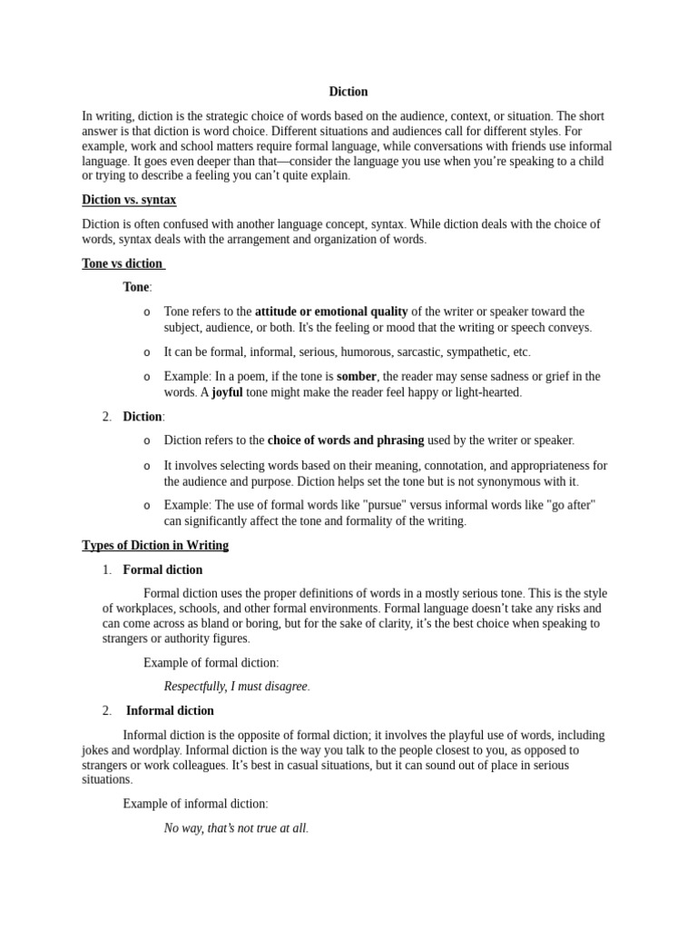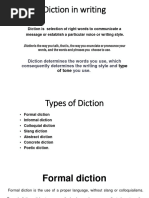 o Diction refers to the choice of words and phrasing used by the writer or speaker.