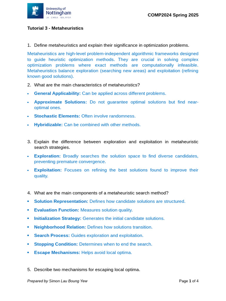1. Define metaheuristics and explain their significance in optimization problems.